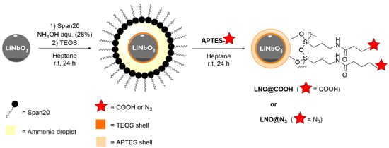 The use of reverse MEs was investigated in order to achieve a high control over the size and monodispersity of the resulting colloidal suspension of silica-coated LNO NPs. A two-step procedure was applied, involving the addition of TEOS for polycondensation at the NP surface through the Stöber process, followed by addition of the APTES derivative (APTES-COOH or APTES-N3), as shown in Scheme 1.