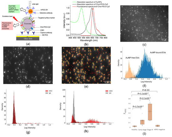 Recently, we developed a facile method to detect surface proteins on individual exosomes, using AuNPs coupled with a dual imaging approach (Figure 3) [68]. In this method, small exosome-like EVs were captured onto a multi-well Au chamber slide via CD81 antibodies and labeled with cholesterol-PEG-Cy5 (Chol-PEG-Cy5, molecular weight 2000) and localized by fluorescence imaging with an angled laser excitation. Targeted specific surface proteins on EVs were labeled with antibody-conjugated 60 nm AuNPs and detected using dark field imaging. Dual mask (EV) and target (surface protein) images were achieved with a dual fluorescence and dark field imaging system at single EV and single particle level. Superimposing the mask and target images identified AuNP-bound EVs and AuNP-free EVs. Image analysis with a python-code-based single vesicle dual imaging analysis (SEDIA) method gives the EV population density profile, which shows the AuNP-bound and AuNP-free EVs. Calibration with AuNPs linked with IgG control, the dual imaging single vesicle technology (DISVT), determines the fraction of marker-targeted EVs of all captured EVs. Using DISVT, we demonstrated that DISVT, but not ELISA, detected human epidermal growth factor receptor 2 (HER2)-positive breast cancer by quantification of HER2-positive EVs among the CD81-positive plasmon EVs. This DISVT needs less than 10 µL of 20–1000 times diluted plasma per assay. The SEDIA can analyze multiple pre-processed images simultaneously and within seconds. Due to its advantages in terms of simplicity, sensitivity, and sample consumption, this facile and ultrasensitive DISVT holds great promises for clinical cancer diagnostics and real-time monitoring.