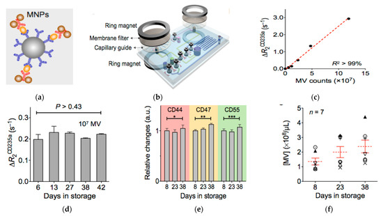 Magnetic nanosensor for the detection and profiling of microvesicles derived from red blood cells (RBC). (a) Schematic of microvesicle labeling with MNPs. (b) Schematic of the µNMR system showing the derived sensor coupled with membrane filter for microvesicle separation. (c) Relaxation rate change (ΔR2CD235a) versus the number of microvesicles using CD235a targeted MNPs. (d) ΔR2CD235a at different days of red blood cell storage showing stable vesicle expression of CD235a. (e) Relative changes in the expression levels of CD44, CD47, and CD55 during storage of red blood cells showing little changes in the expression levels of these proteins on microvesicles. * p > 0.48; ** p > 0.15; *** p > 0.17. (f) Microvesicle concentration over storage time showing the increase of the amount of microvesicles with storage time. Reprinted with permission from [148]. Copyright (2013) American Chemical Society.