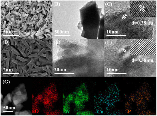 (A–C) SEM, TEM, HR-TEM images of WO3; (D–F) SEM, HR-TEM images of Co-Pi/WO3; (G) EDS elemental mapping images of W, O, P and Co in Co-Pi/WO3.