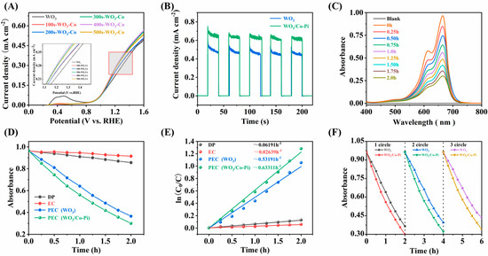 (A) LSV curves of WO3 films before and after Co-Pi modification under 100 mW·cm−2 light; (B) photoresponse current profiles of WO3 films before and after Co-Pi modification; (C) UV absorption spectra of MB degraded by Co-Pi/WO3 films under AM1.5 illuminations at 1 V applied voltage; (D) DP, EC and PEC degradation of MB under AM1.5 illuminations at 1 V applied bias voltage before and after Co-Pi modification of WO3 films; (E) corresponding kinetic curves before and after Co-Pi modification of WO3 films; (F) variation of the performance of MB degradation under PEC conditions with three cycles.