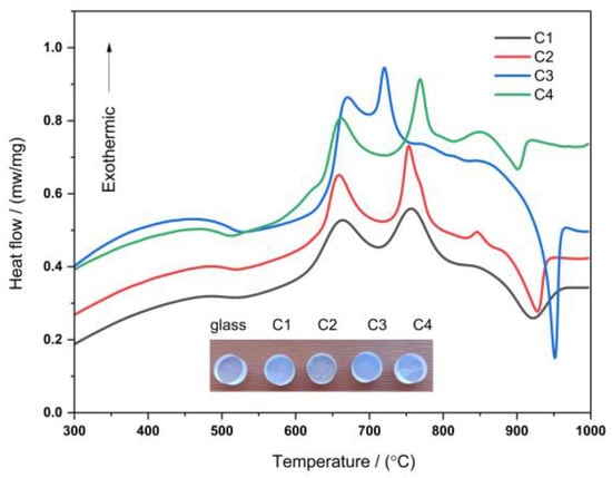 DSC curve of C1~C4 lithium aluminosilicate glasses and pictures of glass and glass-ceramics.