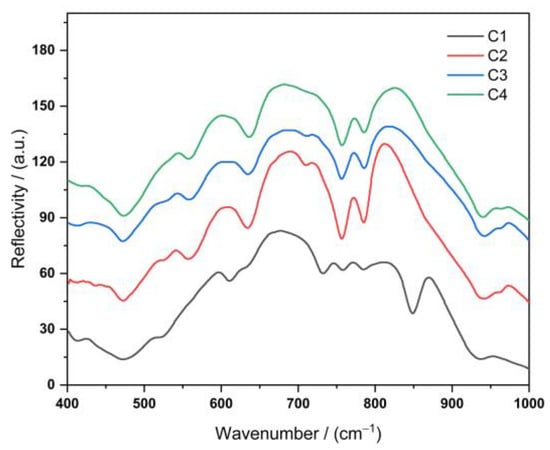 In addition to the characteristic vibrations discussed above, a moderate-intensity band located at approximately 850 cm−1 was observed in the C1 sample, which was attributable to the characteristic vibrations of the nonbridging oxygen [Al–O6] octahedra [39]. This band was not observed for the other samples, indicating that some of the [Al–O6] octahedra were transformed into [Al–O4] tetrahedra. The remaining [Al–O6] octahedra were not connected to the lithium aluminosilicate glass network. As a result, the homogeneity of lithium aluminosilicate glasses is reduced [40]. All the samples exhibited a strong absorption band in the 720–780 cm−1 region, which indicates that this band corresponds to the characteristic vibration of the Al–O covalent bond in the [Al–O4] tetrahedra present within the perovskite feldspar [41]. The Si–O–Al bending vibration (560 cm−1), Al–O–Si symmetric stretching vibration (640 cm−1), O–Si–O symmetric stretching vibration (765 cm−1), and Si–O–Si (793 cm−1) symmetric stretching vibrations were significantly weaker in the C1 sample than in the other samples. This is probably due to the C1 formulation containing a lower amount of O2− ions than the other samples, and therefore, it cannot form more oxygen bridges.