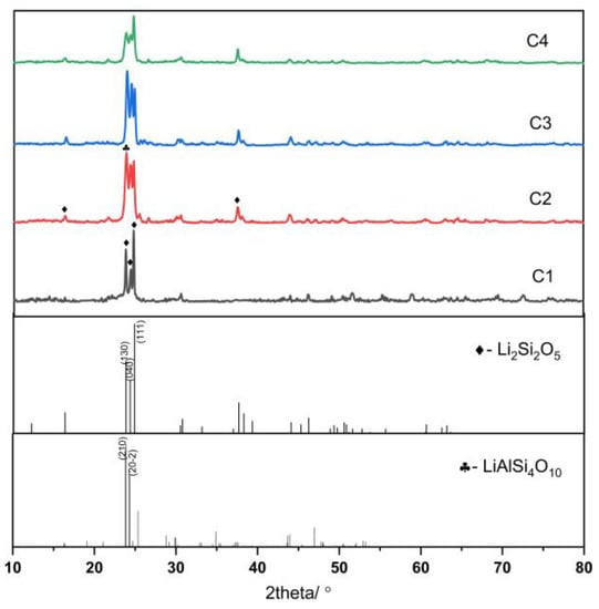 The properties of glass-ceramics depend on the percentage of crystalline phases formed, the type, composition, shape, and size of the crystals, and the residual glassy phase composition [35]. As shown in Figure 4, all four samples exhibit Li2Si2O5 (JCPDS #40-0376) and LiAlSi4O10 (JCPDS #35-0463) crystalline phases, and the crystallinity and crystal proportion of the four lithium aluminosilicate glasses differ according to the MDI Jade 6.5 analysis.