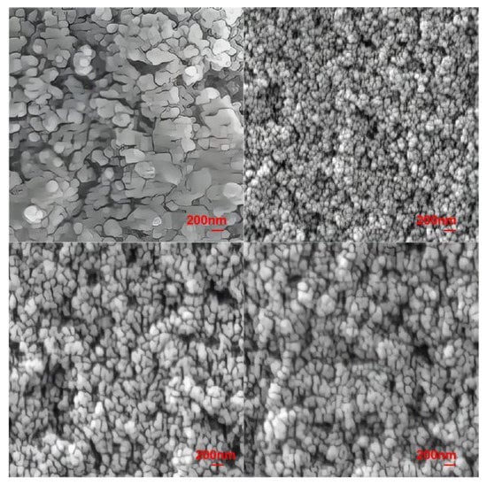 To determine the crystal size and morphology of the investigated glass-ceramics and lay a good foundation for further analysis of the relationship between the degree of crystallization and the resulting properties, field emission SEM (FESEM) imaging was conducted [35]. The crystal morphologies of the four lithium aluminosilicate glass-ceramics are shown in Figure 5.