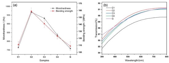 Figure 6a shows the bending strength and microhardness of the four lithium aluminosilicate glass-ceramics. In order to clarify the advantages and disadvantages of the mechanical and optical properties of glass-ceramics, its performance is compared with that of a certain high aluminosilicate glass G. High aluminosilicate glass G is the mainstream cover glass for touch screen devices in the market today. The curves show that the hardness and bending strength from high to low of the samples can be arranged as C2, C3, C4, and C1. Compared with the C1 sample, the flexural strength of the C2 sample increases by 37.9% and the microhardness increases by 51.4%. From C2 to C1, the crystallinity of the samples decreased but the grain size increased. It can be seen that degree of crystallinity and crystal size affect the mechanical properties of glass-ceramics.