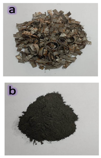Photographs of Fe waste taken before and after 3 h of HEBM milling are depicted in Figure 1a,b. It should be obvious that the Fe waste material is gray in color and appears as little crusts before grinding (Figure 1a). Fe is ground until it is very fine and turns into a dark grey powder (Figure 1b).