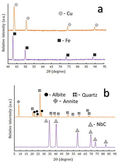 The XRD patterns of (a) as-received Fe waste after milling and Cu powders, and (b) as-received NbC and granite powders.