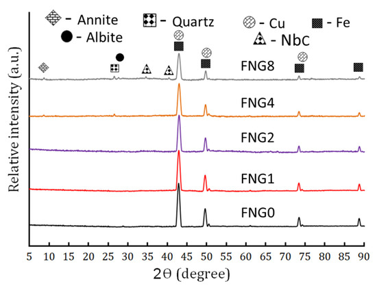 The series of XRD spectra of the Fe–Cu alloy-based nanocomposites having different volume percentages of hybrid reinforcements (i.e., NbC and granite) after milling for 10 h are shown in Figure 3. According to the existence of their distinctive XRD peaks, it appears that only Fe and Cu phases are seen in the FNG0, FNG1 and FNG2 samples. For the FNG4 sample, the characteristic XRD peaks for granite are clearly visible next to those represented by Fe and Cu. However, the characteristic XRD peaks of NbC are seen only in the last sample, i.e., FNG8. The main reason behind the absence of NbC and granite peaks in FNG1 and FNG2 samples and the absence of XRD peaks of NbC in the FNG4 sample is that the levels of these reinforcements are minimal and regarded as being below the XRD device’s detection limit [32]. It is also observed with the increase of the contents of the reinforcements in the nanocomposite samples, the width of the Fe and Cu peaks increases and the intensity of the same peaks also decreases. The size of the crystal, density of the dislocation, and lattice strain of the strong peaks for all samples were estimated and summarized in Table 4 in accordance with these observed changes. This table shows how the concentration of hybrid ceramics causes a decrease in crystal size and an increase in lattice strain and dislocation density. These outcomes can be attributed to the significant lattice deformation and grain size refinement that take place during the milling process [33,34]. XRD charts specify crystal sizes of 29.73, 27.58, 22.69, 19.95, and 15.80 nm for the ground powders of specimens labeled FNG0, FNG1, FNG2, FNG4, and FNG8, respectively.