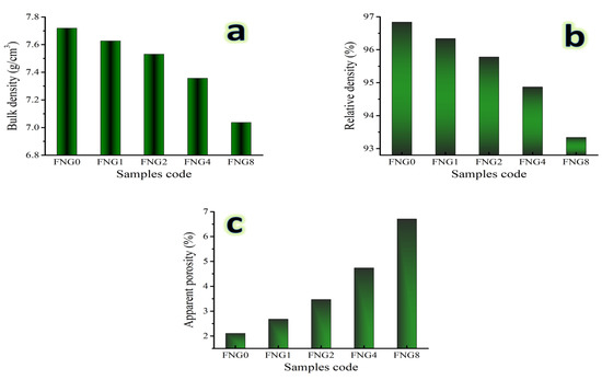 Density is known to be a very important property to be measured for composites prepared by PM. It is common knowledge that the mechanical characteristics of nanocomposites are changed during the sintering process by the pores that may form as a result of the necking of the powder particles. The bulk density, relative density, and apparent porosity of the Fe alloy and its nanocomposites, sintered at 1150 °C for 1 h in an environment of argon, are shown in Figure 8a–c. The theoretical densities of the FNG0, FNG1 FNG2, FNG4, and FNG8 samples, which are 7.791, 7.971, 7.863, 7.755 and 7.539 g/cm3, respectively, are taken into consideration. It can be seen from this graph that the increasing volume percentage of the hybrid reinforcement is what causes the samples’ notable decrease in bulk and relative densities and rise in porosity values. This decrease in both ρ and RD with an increase in apparent porosity is due to several factors. First of all, the density of the granite reinforcement, 2.65 g/cm3, is significantly lower than that of the Fe–Cu matrix, 7.97 g/cm3. Second, less particle rearrangement occurs during sintering because the melting point of NbC (~3490 °C) is substantially higher than that of Fe (~1.538 °C) and Cu (~1083 °C). Finally, the volume % of additive hybrid ceramics has a direct impact on the growth of the contact surfaces, the production of closed pores, and the growth of the grain.