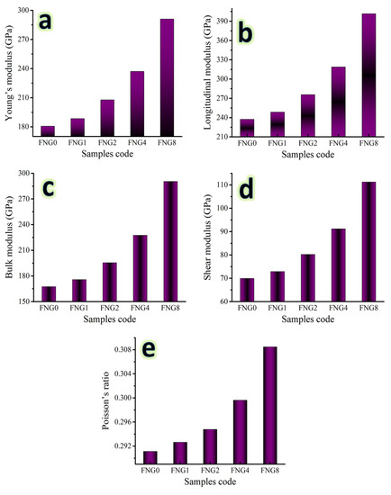 - The remarkable improvement in microhardness, ultimate strength and longitudinal modulus reached 269.9, 383.1 and 401.62 GPa for the sample, which improved about 93.7, 74.8 and 68.8% compared to the FNG0 sample.