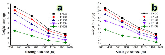 Weight loss of the Fe alloy and its nanocomposites as a function of the sliding distance at a load of (a) 10 N and (b) 30 N.