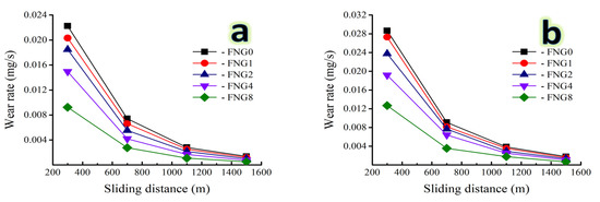 - The Fe alloy’s wear resistance was considerably enhanced by introducing hybrid reinforcement and increased sliding slip, which decreased with increasing applied stresses. The wear rates for the FNG0 and FNG8 samples were 0.0222 and 0.0092 mg/s, respectively, after a sliding distance of 300 m and an applied force of 10 N, while the wear rates were 0.00138 and 0.00052 mg/s, respectively, after a sliding distance of 1500 m at the same applied load.