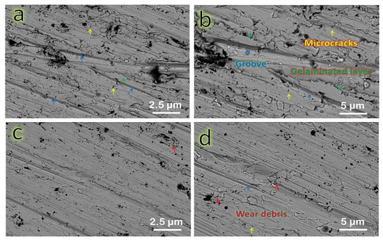 Using FESEM measurements at various magnification powers, the worn surfaces of the FNG0 and FNG8 samples were examined at a sliding distance of 1500 m and under an applied stress of 30 N to evaluate the wear processes of the Fe–Cu matrix and its nanocomposites, as shown in Figure 15a–d. For the Fe–Cu matrix, only loose layers and grooves appear on the wear track as shown in Figure 15a,b. Surface delamination reveals adhesive wear, which includes crack initiation and propagation as well as final fracture of the material in the vicinity of the surface [53,54]. Figure 15c,d shows that the FNG8 sample has a smoother surface than the FNG0 sample, and there is only sporadic debris and slight grooves on the worn surface. Some Fe–Cu alloy debris has flattened in the wear process because of its low microhardness. Very low cracks appear in this wear track, thus, the dominant wear mechanism is abrasive wear [55,56].