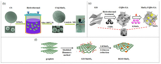 For example, Chhabra et al. [43] prepared α-MnO2-RGO nanocomposite by a facile hydrothermal method with RGO reduced by chemical reduction (Figure 1a). In the nanocomposite, the one-dimensional (1D) rod-shaped MnO2 increases the flow of electrons in the longitudinal direction and reduces the possibility of electron-hole pair bonding. On the other hand, two-dimensional (2D) RGO nanosheets have a large surface area and pore volume, which can prevent charge recombination by aiding in the quick transport of the charges. With the introduction of RGO nanosheets, the surface area of the material increased to 87.159 m2g−1, and the composite photocatalyst exhibited efficient adsorptive photocatalytic performance. Wang et al. [76] prepared CNT-MnO2 composite film by depositing MnO2 nanosheets on CNT film using the hydrothermal method. Under different hydrothermal times, the coverage of MnO2 on CNTs films will change. The optimized composite film can be folded into different sizes and shapes, exhibiting excellent flexibility and stability. Doping metal or non-metal on carbon materials or MnO2 can incorporate the unique characteristics of different materials to improve performance [77,78,79,80,81,82,83,84,85,86]. Shan et al. [87] first prepared K and Na atom doped g-C3N4 via the thermal treatment of thiourea and KBr/NaBr, respectively, and then added them into KMnO4 solution for hydrothermal reaction to synthesize K/Na doped g-C3N4@MnO2 composite. The MnO2 nanosheets were vertically assembled on the surface of g-C3N4 with a stable structure and shortened the diffusion path lengths for electrons. Metal atoms intercalated into the g-C3N4 interlayers, which enhanced the conductivity, served as the charge transfer channel between adjacent layers to promote charge transfer and hinder the recombination of photogenerated carriers.
