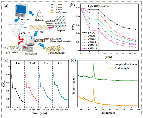 (a) Preparation process scheme; (b) Photocatalytic degradation rate under the visible light irradiation; (c) Recycle experiments for the degradation of TC and (d) XRD patterns before and after four runs of CMG-10. Figures reprinted with permission from ref. [227]. Copyright 2021; Elsevier Ltd.