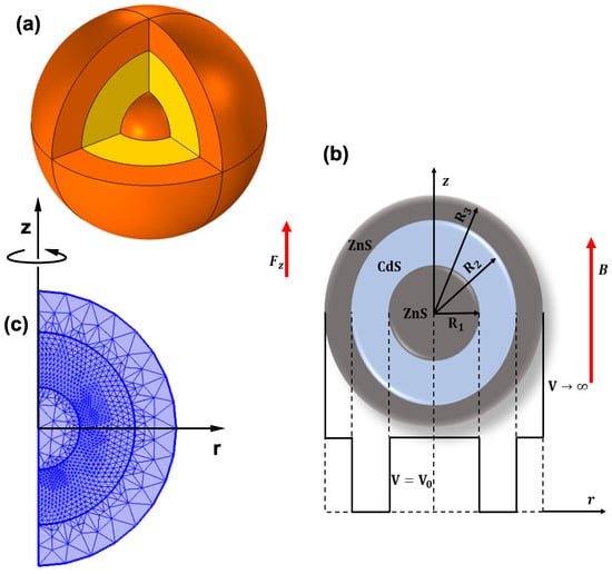 (a) ZnS/CdS/ZnS spherical quantum dot heterostructure considered in this work. In (b), the dimensions of the quantum dot and the applied axial electric and magnetic field are indicated together with the radial dependent confinement potential. In (c) is depicted the -projection of the heterostructure (where cylindrical coordinates are considered) together with the refined mesh used in the finite element method calculations.