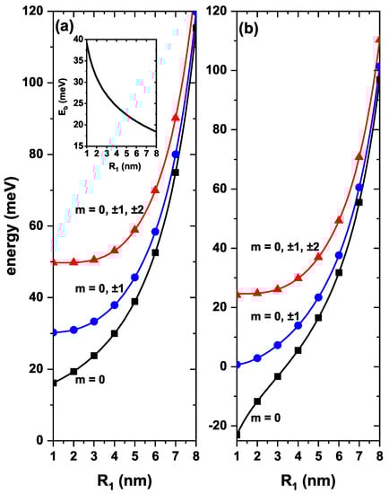 The first three lowest electronic states of a ZnS/CdS/ZnS spherical core/shell/shell quantum dot as functions of the radius. Figure (a) presents the results without, and (b) those with effects of an on-center donor impurity, with nm and nm, for different values of the m-quantum number and without effects of external electric and magnetic fields. Labels close to the curves indicate the values of the m-quantum number. The inset in Figure (a) corresponds to the ground state (lowest state with ) binding energy between the impurity and the electron as a function of the internal dot radius. In both panels, solid symbols correspond to the energies obtained by solving the three-dimensional problem using Equation (1).