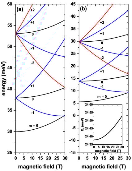 Figure 3 contains plots of the lowest three electronic states in a ZnS/CdS/ZnS spherical core/shell/shell QD as functions of the applied magnetic field with and without on-center shallow donor impurity effects for several values of the m-quantum number. From Figure 3a, it is possible to observe that the magnetic field breaks the first excited state triple degeneracy and the second excited state degeneracy. States with a positive value of m always increase in energy with the strengthening of the applied magnetic field. For states with a negative m-value, energies initially show a decreasing character with the magnetic field. They evolve to reach a minimum value, becoming the actual ground state of the system and, then, start to augment. Consequently, as a result of the modification of the energy spectrum due to the increment in magnetic field intensity, the ground state does not preserve the s-like symmetry. From this figure, it is also noticed that, with a zero magnetic field, the first and second excited states have degeneracies of order three and five, respectively, as indicated in the discussions of Figure 2a,b. On the other hand, Figure 3b shows the energies as functions of the external magnetic field, taking into account the effects of the donor impurity at the center of the QD. As commented, energy levels shift towards lower values due to the attractive nature of the Coulombic coupling with the ionized impurity. It is seen that in Figure 3a,b, the energy behavior shows the same trend. Actually, the impurity effect under the magnetic field is not very noticeable compared to the system without the impurity since it changes from about 3.723 meV to 3.874 meV. This is reflected in the binding energy (see inset in Figure 3b), where it increases as the magnetic field increases.