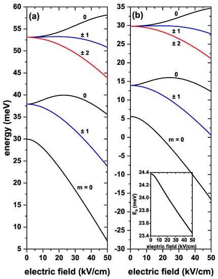 The lowest electronic states in a ZnS/CdS/ZnS spherical core/shell/shell quantum dot as functions of the applied electric field. In (a), results are presented without, and in (b) with on-center donor impurity effects, with nm, nm, and nm. Different values of the m-quantum number and without external magnetic field effects have been considered. Labels above each of the curves give the values of the m-quantum number. The inset in (b) corresponds to the ground state (the lowest state with ) binding energy as a function of the applied electric field.