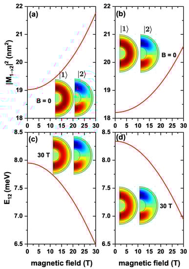 Plots in Figure 6, represent results for the same quantities as in Figure 5 but considering the variation of the intensity of the applied static magnetic field. From Figure 6a, it is noticed an increase in as the strength of the applied magnetic field increases. This happens because the ground state gradually changes from a uniformly distributed probability density at to a concentrated probability density at the upper and lower regions of the QD for T. At these regions, the first excited state presents its maximum probability density, so the overlap between wavefunctions becomes larger. Effects associated with an on-center donor impurity appear in Figure 6b, showing the same behavior as in Figure 6a. That is, when comparing the values of for the system with and without impurity, a lower value is seen when there are impurity effects. For example, when , in the absence of any impurity, has a value of 19.024 nm. In the case that considers the presence of an ionized impurity, it has a value of 18.208 nm. Switching on the magnetic field to T leads to a similar behavior. In the case without impurities, it has a value of 21.760 nm, and for the case with an on-center donor, it has a value of 20.581 nm. This is because, at zero applied magnetic field, the ground state wave function has its probability density concentrated around the impurity. The first excited state presents a more significant probability density localization at the upper and lower QD regions, thus producing a smaller overlap between the involved states. In the 30 T case, the ground state wave function probability density is concentrated at the upper and lower areas of the QD. Consequently, the overlap with the first excited state wave function grows since its probability density largely locates within the same regions. At the same time, Figure 6c,d show the transition energy from the ground state to the first excited state, with and without a donor impurity. It can be observed that as the magnetic field increases, this quantity diminishes. This happens because the action of the magnetic field is to bring together the energies of the ground state and the first excited state for (see Figure 3). So, the higher the magnetic field, the smaller the difference between these energies. From both plots, it can be seen that the transition energy is higher for small magnetic fields with donor impurity effects than when the impurity is not considered. This is due to the impurity-induced energy shift towards lower values, making the difference in greater. This shift has an average magnitude of 0.412 meV.