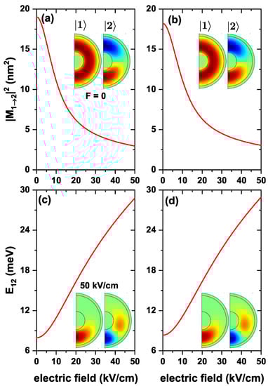 Figure 7 concerns to the same kind of study reported in previous Figure 5 and Figure 6, considering the applied electric field as the external probe. Results plotted in Figure 7a show that as the applied electric field strengthens, there is a magnitude decay of . Initially. it reaches a maximum value for , and then, it decreases. This maximum appears because the ground state wave function is uniformly distributed over the QD confinement region. In contrast, the first excited state has its lobes concentrated at , thus producing the largest wave function overlap. The decreasing nature of is because the electric field pushes and toward ; for example, at kV/cm the state is concentrated at , and the lower lobes of state are also concentrated there, giving the lowest overlap (see inset in Figure 7). In Figure 7b, the results presented include the effects of the donor impurity. A behavior very similar to the system without impurity is noted, with the difference that, for small values of the electric field, has a smaller magnitude. For example, for , without impurities, has a value of 19.024 nm, and 18.208 nm with impurity, although this difference begins to disappear as the electric field increases. This situation has to do with the electron-impurity interaction. For low electric fields, it is the dominant one -since the electron is closer to the impurity-. In contrast, it loses strength in large fields due to the more significant electron-impurity separation. In this case, the ground state wave function gets closer to the impurity, so the overlap is smaller than in Figure 7a. Finally, Figure 7c,d show the transition energy from the ground state to the first excited state, with and without impurity in the structure. In this plot, increases as the electric field strengthens. The reason for this variation is that an increase in the electric field implies greater electron confinement. As plotted in Figure 4, all energies exhibit a decreasing trend, but the ground level decreases at a faster rate compared to the first excited one. When evaluating , a more significant difference is obtained. On the other hand, by comparing Figure 7c,d, it is observed that for zero electric fields, the transition energy is greater for the case with impurity, but as the electric field increases, this difference disappears, which indicates that the action of electric field predominates in the system.