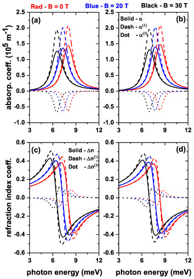 - Portacio, A.A.; Jiménez, A.F.; Urango, M.P. Theoretical study on the change of index of refraction and the optical absorption in a quantum dot in the presence of a uniform magnetic field. Rev. Mex. Fis. 2016, 62, 330–335. [Google Scholar]