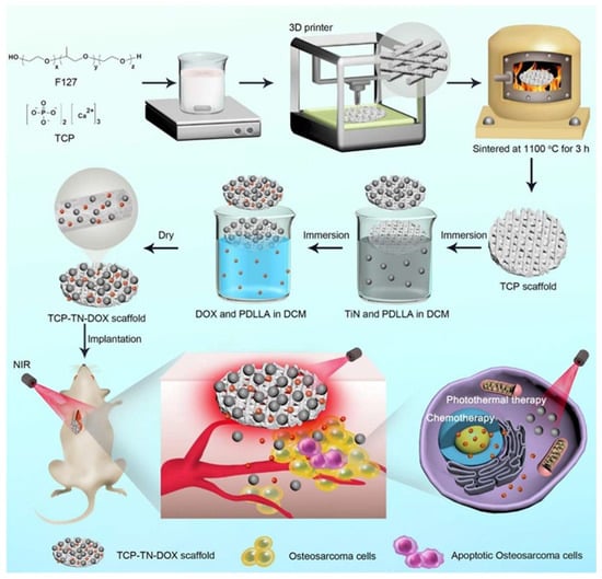 Schematic illustration of the fabrication and application of TCP–TN–DOX scaffolds for therapy of osteosarcoma. F127 and TCP were mixed to obtain homogeneous printing glue for printing scaffolds using a 3D printing machine. The scaffolds were then sintered to obtain TCP scaffolds, which were immersed into solutions containing TiN and PDLLA, and solutions containing DOX and PDLLA to obtain TCP–TN–DOX scaffolds. The TCP–TN–DOX scaffolds were implanted into mice bearing osteosarcoma to achieve synergetic effects of photothermal therapy and chemotherapy (reproduced with permission from Reference [38], Copyright 2021, American Chemical Society).