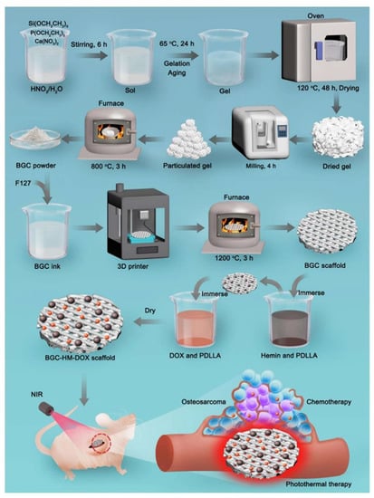 Schematic illustration of the process for preparing BGC-HM-DOX scaffold and its application for the combined photothermal therapy and chemotherapy of osteosarcoma. Hemin particles and DOX are integrated onto 3D-printed BGC scaffolds by using the polymer PDLLA as the medium. The BGC bulk scaffold can offer mechanical support for bone tissue after implantation into bone defects derived from surgical removal of osteosarcoma (reproduced with permission from Reference [39], Copyright 2021, Elsevier).