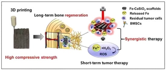 Calcium silicate (CaSiO3) is the simplest silicate bioceramic. Fe-CaSiO3 composite scaffolds capable of synergistic therapy were fabricated via 3D printing (3DP) technology [47]. On the one hand, PTT could be provided by localized surface plasmon resonance of Fe. On the other hand, the Fenton reaction could be activated by the release of Fe2+, which promoted the decomposition of H2O2 to generate reactive oxygen species (ROS) to kill tumor cells (Figure 4). The synergistic effect of PTT and ROS increased the mortality rate of tumor cells to 91.4% in vitro. Moreover, the scaffolds exhibited a compressive strength of 126 MPa, which is within the compressive strength range of dense human bones, providing adequate mechanical support for cortical bone defects. In addition, when testing the osteogenic ability of the scaffolds in vivo, rabbits were irradiated by the NIR light of 808 nm at 0.8 W/cm2 for 10 min, and no adverse effect was found of the short-term PTT on long-term bone regeneration.