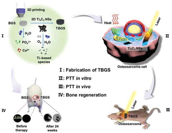 Schematic illustration of the fabrication of TBGS, ablation of bone cancer, and regeneration of bone tissue. (I) Fabrication procedure of TBGS, including 3D printing of pure BGS, integration of Ti3C2 MXene, and degradation of Ti3C2 MXene on BGS. (II,III) TBGS used for osteosarcoma cell elimination by photothermal ablation both in vitro (II) and in vivo (III). (IV) Bone-tissue reconstruction and the therapeutic results after the implantation of BGS and TBGS (reproduced with permission from Reference [65], Copyright 2019, John Wiley and Sons).