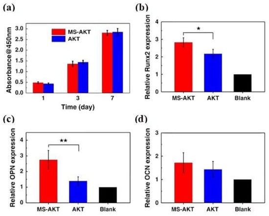 (a) osteogenic gene expression (Runx2, OPN, and OCN) (b–d) of rBMSCs in the MS-AKT and AKT scaffolds at day 7 (* p < 0.05, ** p < 0.01). Cells spread well and were closely attached on both MS-AKT and AKT scaffolds. The proliferation of rabbit bone mesenchymal stem cells (rBMSCs) cultured with MS-AKT and AKT scaffolds had no significant difference at each time point (one, three, and seven days), indicating the good cytocompatibility of MS-AKT scaffolds. MS-AKT scaffolds could stimulate bone-related gene expression of rBMSCs, including Runx2 and OPN (reproduced with permission from Reference [76], Copyright 2017, Springer Nature).