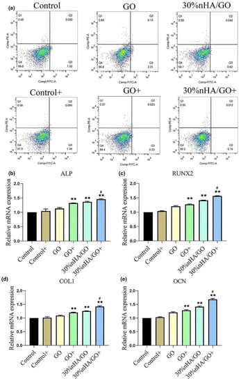 Relative proliferation rates and osteogenic differentiation of hBMSC. Relative proliferation rates of hBMSC co-controlled using GO or 30% nHA/GO particles at a concentration of 50 μg/mL with or without NIR irradiation, examined by (a) flow cytometry. Expression of osteogenic differentiation-specific genes in hBMSC after incubation with GO or 30% nHA/GO in osteogenic induction medium at a concentration of 50 μg/mL with or without NIR irradiation after seven days: (b) ALP, (c) Runx2, (d) COL1, and (e) OCN (** p < 0.01, comparison between control group and other groups. # p < 0.05, comparison between GO + group and 30% nHA/GO + group) (reproduced with permission from Reference [86], Copyright 2020, Elsevier).