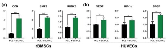 (a) Osteogenic gene (OCN, BMP2, RUN2) expression of rBMSCs cultured on 3D printed PCL and 4-SC/PCL composite scaffolds for 7 days. (b) Angiogenic gene (VEGF, HIF-1α, BFGF) expression of HUVECs cultured on 3D printed PCL and 4-SC/PCL composite scaffolds for 7 days (* for 0.01 < p < 0.05, ** for 0.001 < p < 0.01, and *** for p < 0.001). (Reproduced with permission from Reference [114], Copyright 2021, John Wiley and Sons).