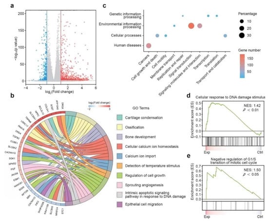 Mechanism of CaPCu-scaffold-based PTT unveiled by mRNA transcriptome. (a) Volcano map displaying the genes regulated by CaPCu-scaffold-based PTT (p < 0.05, |fold change| ≥ 2). (b) Chord plot, (c) KEGG analysis, and (d,e) GSEA of differentially expressed genes between the Exp and Ctrl groups (reproduced with permission from Reference [115], Copyright 2021, John Wiley and Sons).