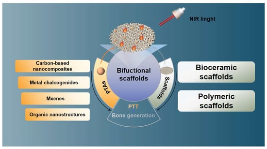 Osteoinductive and osteoconductive graphene has been shown to improve osteogenesis, in addition to tunable photothermal properties [101,102]. The composite scaffolds prepared by mixing Gel, nHA, CS, and graphene could be rapidly heated to kill tumor cells after NIR laser irradiation [103]. Furthermore, the composite scaffolds could accelerate the proliferation of pre-osteoblastic MC3T3-E1 cells in a mild photothermal environment.
