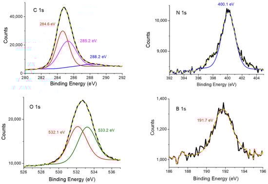 XPS is a quantitative surface analysis technique, which can be used to determine elemental composition and the environment of the elements existing on the sample’s surface. Figure 4 shows the C 1s, N 1s, O 1s, and B 1s regions of the Porph-UOZ-COF’s XPS spectra. The C 1s peak (84.1 wt %) displays three carbon families at 284.6, 285.2, and 288.2 eV, attributable to sp2 C (-C=C-), sp3 C (-C-C-)/-C-N-, and -C=O functionalities, respectively [7,38]. Figure 4 also shows that the N 1s spectrum (2.4 wt %) can be fitted with binding energies of nitrogen atoms of pyrroles of the porphyrin monomers (mainly at 400.1 eV) [39]. The O 1s spectrum (12.4 wt %) of Porph-UOZ-COF exhibits two obvious components at around 532.1 eV and 533.2 eV for -C-O species and -C=O groups [7,38]. Notably, the XPS spectrum of the B 1s binding energy (1.1 wt %) revealed a peak at 191.7 eV [40], which agrees with the expected value for B atoms in the pentagonal C2O2B ring.