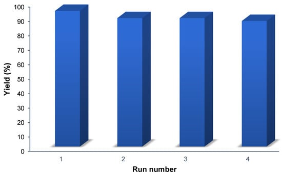 The recyclability of Porph-UOZ-COF was assessed for the tandem photooxidation–Knoevenagel coupling reaction between benzyl alcohol and malononitrile. Porph-UOZ-COF was easily recovered by centrifugation, washed, and dried under a vacuum at 100 °C to be ready for the next run. The catalyst could be reused four times, and the product yield decreased gradually from 93 to 87% (Figure 6). This decrease is most probably due to incomplete catalyst recovery and catalyst mass loss rather than partial deactivation by pore blocking.