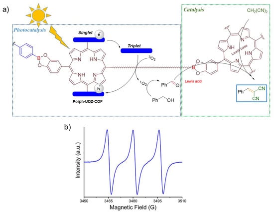 The generation of singlet oxygen (1O2) [15,59,60] during the reaction was also confirmed by an electron paramagnetic resonance (EPR) spectroscopy using a selective 1O2 spin trap. When 2,2,6,6-tetramethylpiperidine (TEMP) [8,61] was used as the specific scavenger for 1O2 under the conditions of the photocatalytic reaction, a characteristic three-line signal corresponding to the generation of persistent TEMPO radical (a strong 1:1:1 triplet signal) derived from the 1O2 oxidation of TEMP was observed (Figure 7b), confirming the photocatalytic activity of Porph-UOZ-COF under aerated conditions to form 1O2 and the suggested mechanism.