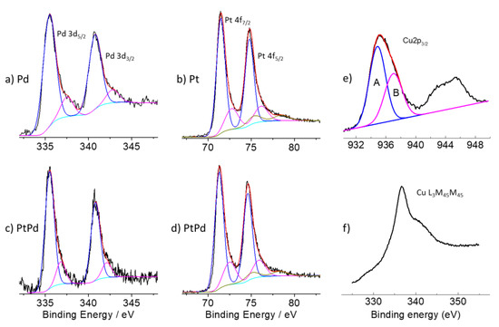 Photoelectron spectra of the regions: (a,c) Pd 3d of Pd-GP, and Pt80Pd20-GP, respectively. The 3d5/2—3d3/2 spin-orbit doublets (blue and magenta line) refer to the Pd0 and Pd(II) states, respectively; (b,d) Pt 4f of Pt-GP, and Pt80Pd20-GP, respectively. The 4f7/2—4f5/2 spin-orbit doublets (blue, magenta, and dark yellow line) refer to Pt0, Pt(II) and Pt(IV) states, respectively. The cyan line refers to the background and the red line superimposed to the experimental data, referring to the sum of all of the Gaussian components; (e,f) Cu 2p 3/2 and Cu L3M45M45 Auger peak of Cu(OH)2.