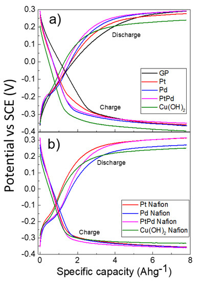 Galvanostatic charge and discharge measurements were performed to further characterize the electrochemical properties of the systems. Figure 4a shows the curves of galvanostatic charge and discharge obtained by the NPs–GP systems. For comparison, the curves obtained by the GP alone were reported. The potential of the electrode was reported as the function of the specific capacity. The fifth cycle of charge–discharge processes has been reported. At this cycle, we observed the stabilization of the electrode potential both in the charge as well as in the discharge direction. In our experiment, the electrodes were charged at a constant current of −100 μA up to a capacity of 7.8 Ahg−1 and then discharged at constant current of +100 μA. The specific capacity was calculated according to Faraday’s law and the works reported by other authors [54,55,56]. In our experiments, at a capacity of 7.8 Ahg−1, the potentials of both charge and discharge processes reach steady state values. At this stage, the equilibria of the most relevant electrochemical processes schematized through the Equations (2)–(8) are established. The electrode potential of Pt-GP (Figure 4a) increases faster than that of the GP alone at the beginning of both charge and discharge processes. This finding reflects the high efficiency of this electro-catalyst, particularly in the form of nanoparticles. The Pd-GP and Pt8Pd20-GP show a higher rate of increase in the charge and discharge electrode potential than Pt, which reflects their superior efficiency with respect to Pt in the HER process, especially when Pd is co-catalyst with Pt [16]. The Cu(OH)2 shows even more negative electrode potential in the charge curve than the noble metals, indicating its significant efficiency toward HER. In the discharge curve, the electrode potential of the Cu(OH)2 is less than of the noble metals, according to the different mechanisms of electro-sorption and desorption reactions onto this materials, previous discussed.