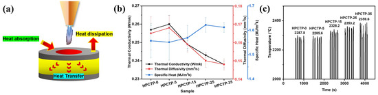 Figure 5f shows that the temperature difference decreases with increasing content of HPCTP, indicating that a large amount of HPCTP is beneficial to suppress the temperature increase inside the material. In addition, the temperature rise rate shows a trend of rising and then falling, which is consistent with the trend of thermal conductivity [