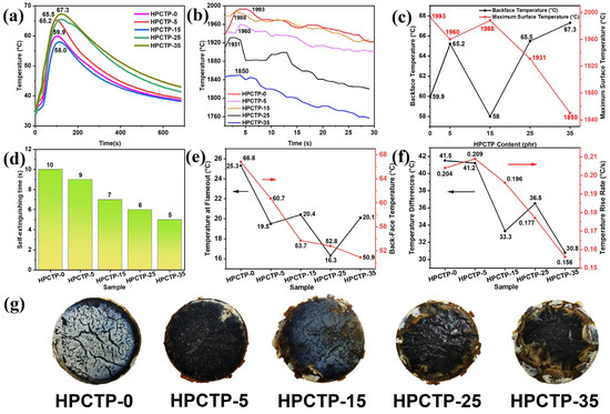 Figure 4e, when the content of HPCTP is 15 phr, the EMVSR-based composite has the highest tensile strength (i.e., 5.01% higher than HPCTP-0) and elongation at break (26.06% higher than HPCTP-0). Compared with HPCTP-0, the elongation at break of EMVSR-based composites increases to the highest at 15 phr HPCTP, and it decreases with further increasing HPCTP content when the content of HPCTP is 25 phr, the elongation at the break increases by 18.62% when compared with HPCTP-0, which is consistent with the excellent ablation performance of HPCTP-25.