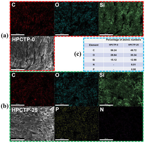 Figure 9a–c shows the mapping images of the char surface and EDS images of the char surface for HPCTP-0 and HPCTP-25, respectively. The char surface of HPCTP-25 is composed of C, O, Si, N, and P. It indicates that HPCTP is involved in the ablation reaction on the surface. The pyrolysis products of HPCTP would have a complex high-temperature reaction with EMVSR on the surface of the char layer, generating solid residues containing N and P that remain on the surface of the char layer. The uniform distribution of P and N indicates that the solid residues containing P and N are uniformly distributed on the surface of the char layer, which helps to improve the denseness and strengthen the char layer. The distribution of P on the surface of the char layer also justifies the presence of phosphate crystals in