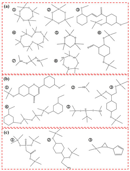Figure 11b illustrates that EMVSR at a higher temperature of 750 °C also produces a variety of aromatic siloxane and linear siloxane structures. In addition, small molecules are detected [