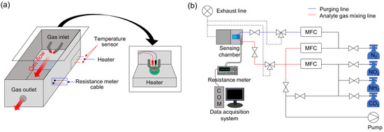 Schematic of a dynamic gas-sensing testbed developed in this work: (a) Gas-sensing test chamber with heating stage and electrical connection. (b) Overall system configuration showing the analyte and purge gas flow direction.