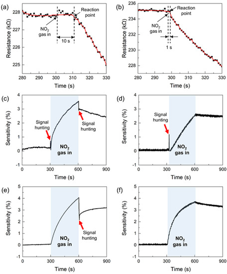 In many gas-sensor studies, most gas-sensing measurement systems usually contain a single gas inlet, which influences the gas sensor performance [40,41,42,43,44]; when the purge gas is introduced, the remaining test gas may be unintentionally introduced from the gas-mixing part. Therefore, a single gas inlet system may cause unexpected abnormal signals behavior, called signal hunting, and the delayed reaction of the gas sensor. Figure 2a shows the delayed reaction of the sensor at the point of NO2 exposure obtained from the gas-sensing test carried out using a single gas inlet system. The sensor showed a resistance change 10 s after exposure to NO2 gas. This is a result of the residence time required for NO2 gas to travel from the MFC outlet to the sensor. Conversely, Figure 2b shows the immediate response of the sensor at the same point by removing the signal hunting using a two-gas inlet system; the mixed test gas and purge gas were separately introduced into the chamber through two-gas inlets. With regard to a system with a single gas inlet, it is possible to evaluate the effects by changing the flow rate of each MFC in advance or by adding a valve in front of each MFC to adjust the on/off duration in advance based on the gas transfer time. However, these alternatives may complicate the system configuration and operating sequence. Consequently, we simplified and improved the system configuration by applying two-gas inlets.
