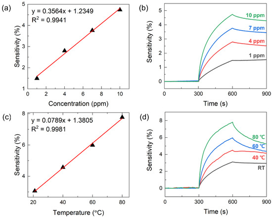 We further investigated the analyte gas concentration and temperature dependence of the sensor sensitivity to determine the optimum operating conditions of the MoS2-based gas sensor. The gas-sensing responses of the sensor for various NO2 concentrations from 1 to 10 ppm are depicted in Figure 4a,b, showing an increase in the sensor sensitivity with increasing NO2 concentration. The sensor responses were obtained from the two-gas inlet system with optimal configuration (angle of 90° and distance of 2 mm) using the time delay on/off valve control. The gas concentration was determined by the analyte to balance the gas volume ratio under standard atmospheric pressure. As the NO2 concentration increased from 1 to 10 ppm, the sensor sensitivity increased linearly to 1.5%, 2.8%, 3.8%, and 4.8% at concentrations 1, 4, 7, and 10 ppm, respectively.