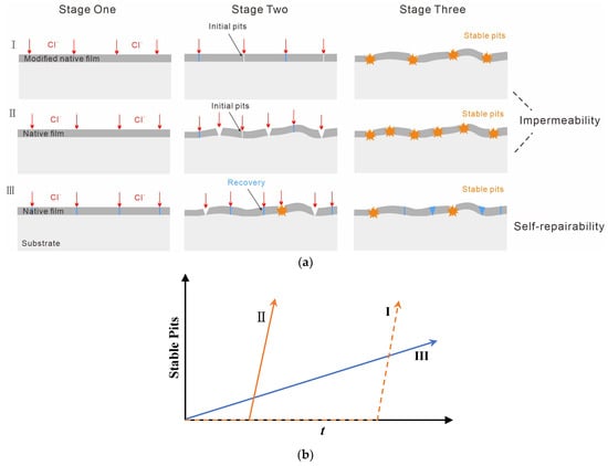 (a) Illustration of the determining dominant factors comparing the development of pitting: I, FE alloy with a typical impermeability-dominated corrosion resistance exhibits the least number of metastable pits at the initial stage due to the modified oxide film; II, Bare alloy with impermeability-dominated corrosion resistance, for which the native film can offer protection for a period; III, Bare alloy with a self-repairability-dominated corrosion resistance, in which metastable pitting occurs early but the stabilization of pits needs a long period of time. (b) The development of stable pits for each protection mechanism.