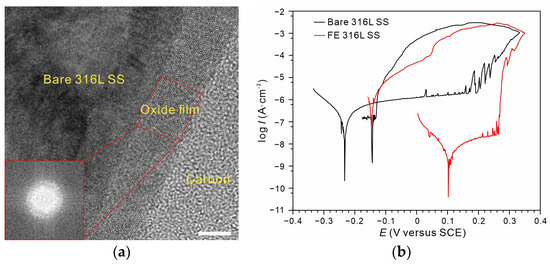 (a) Cross-sectional HR-TEM image of the modified oxide film on 316 L SS (Scale bar, 5 nm). (b) Polarization curves of bare 316 L SS (black) and FE 316 L SS (red) with a reverse scan in 0.6 M NaCl solution (25 °C).